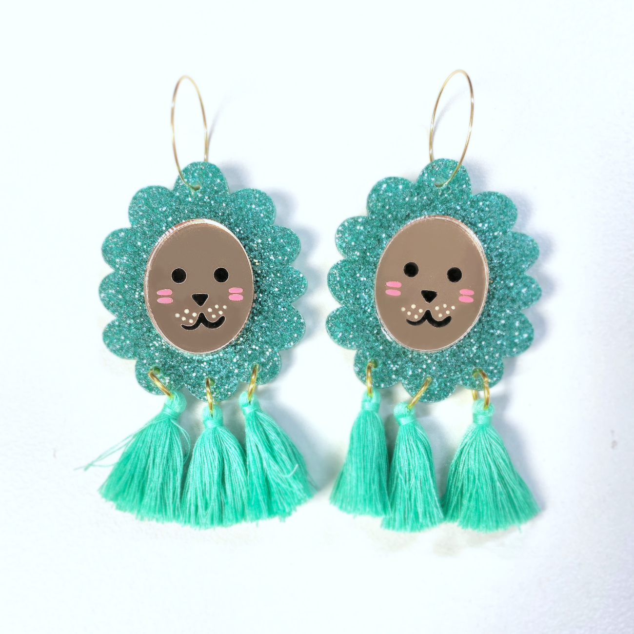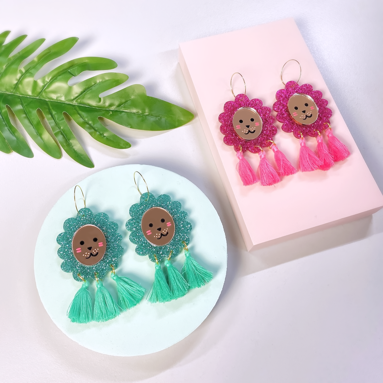 Handcrafted from acrylic, glitter acrylic, hand painted and with gold stainless steel hoops. This is a lightweight earring.